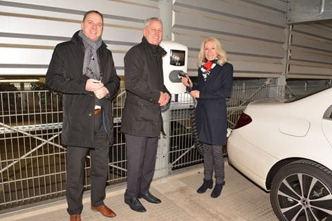 *Installation von Ladesäulen bei Thales Deutschland in Ditzingen. Das Bild zeigt (von links) Alex Meder, Berater Flottenmanagement bei LeasePlan Deutschland, mit Bernd Prause, Head of Facility Management, und Britta Lübben, Fuhrparkmanagerin, beide bei Thales Deutschland.